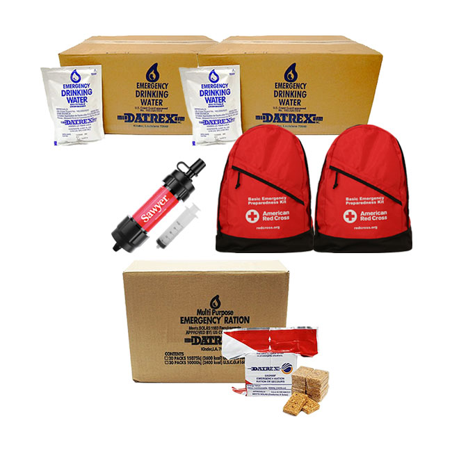 Emergency food, water, water filter and container, hygiene kits & other disaster supplies.